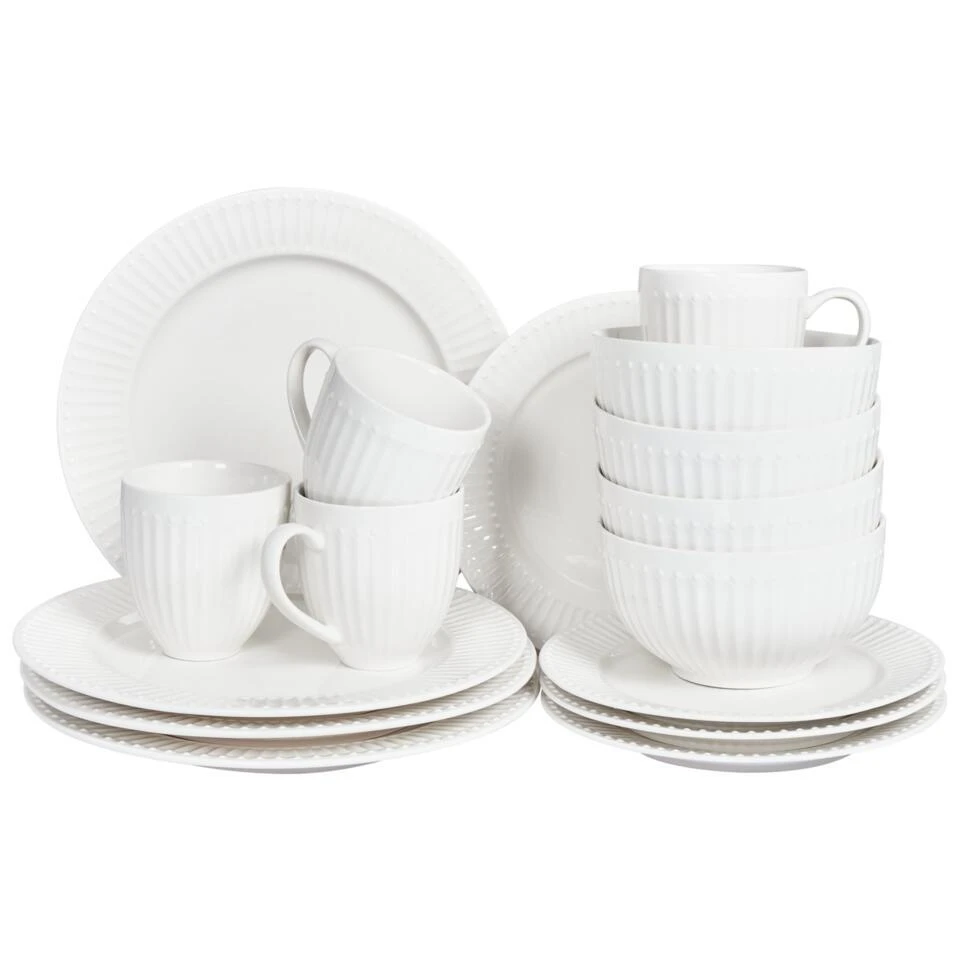 Aanbod omvat: 4 x Dinerbord, 4 x Dessertbord, 4 x Schaal, 4 x Mok