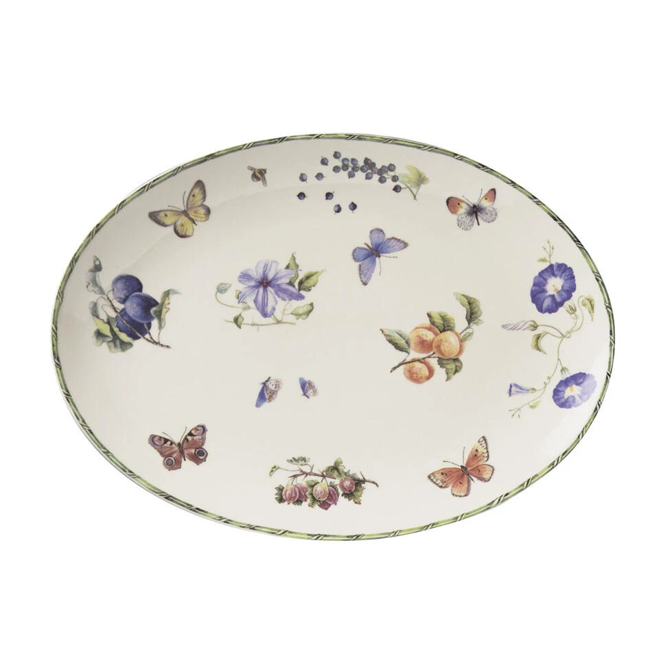 Deze schaal is onderdeel van het Fruit amp Flowers-servies van Janneke Brinkman-Salentijn. Haar kleurrijke en natuurgetrouwe illustraties zijn zo prachtig geschilderd, dat het bijna zonde is om het ovale schaaltje te gebruiken. We begrijpen het daarom volkomen als je deze gewoon als eyecatcher in je servieskast zet.