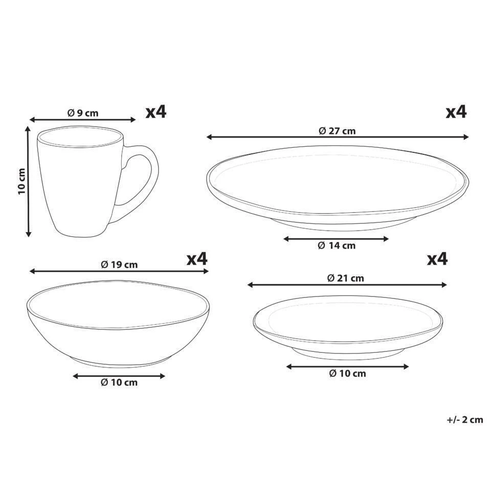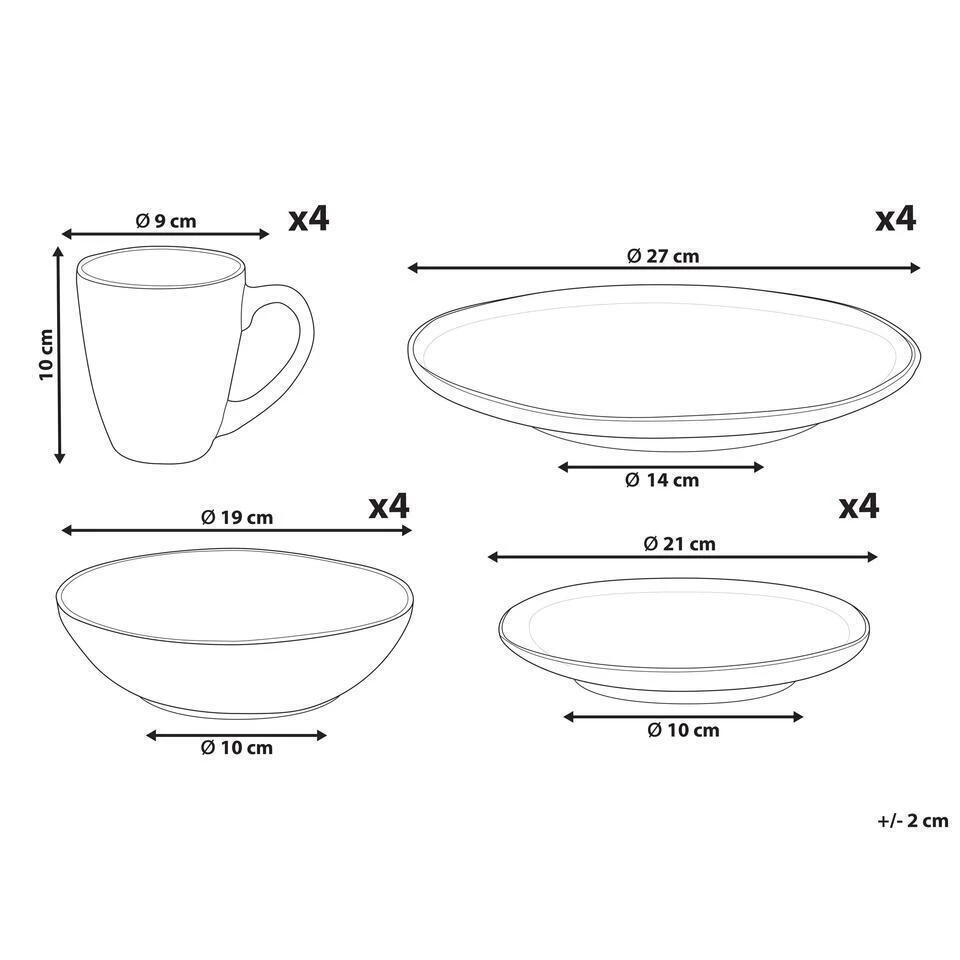 Aanbod omvat: 4 x Dinerbord, 4 x Dessertbord, 4 x Schaal, 4 x Mok