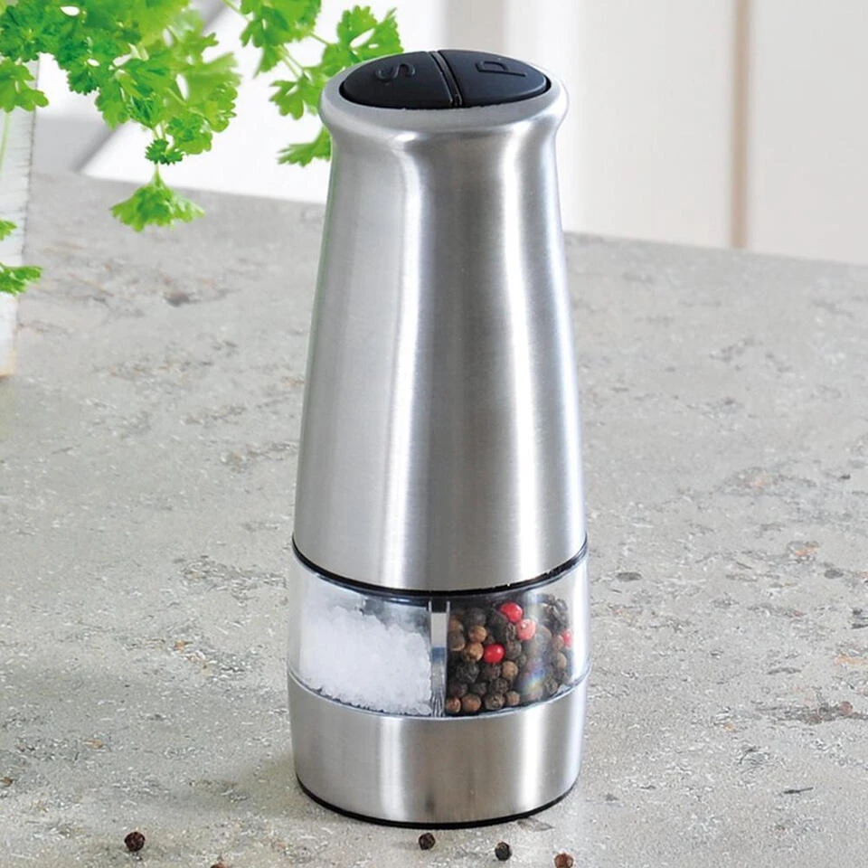 Elektrische pepermolen/zoutmolen. Met een druk op de knop kunnen de kruiden gemalen worden. Voor het malen van peper, zout en kruiden. Afmeting: ca. 7 x 7 x 17,5 cm. Materiaal: rvs. Niet geschikt voor in de vaatwasser.