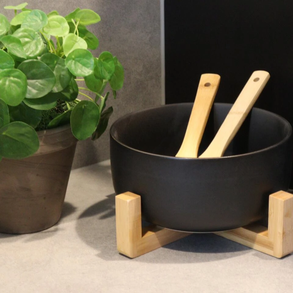 Stevige Slakom Saladeschaal gemaakt van keramiek. De saladeschaal heeft een diameter van 21 cm en een hoogte van 17 cm. De schaal is gemaakt van keramiek en de slacouvert lepels van hoogwaardig bamboe materiaal. Ook de standaard waar de schaal op rust is van bamboe. Bamboe heeft een lange levensduur, is hard, slijtvast en duurzaam. De kom is vaatwasserbestendig.